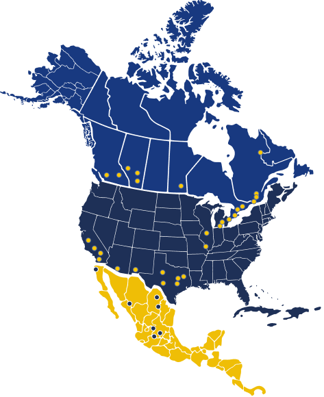 Our logistics footprint extends across North America, connecting key markets with efficiency and precision. We deliver streamlined, reliable cross-border solutions supported by strategic locations and asset-based operations.